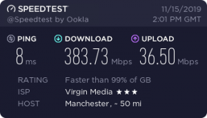 November 2019 update… Virgin’s standard upload speed was increased a while ago, and with Broadband provision in the news I thought I’d see how my connection is doing now: